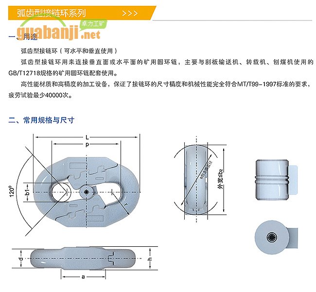 弧齒型接鏈環用來鏈接垂直面或水平面的礦用圓環鏈,主要與刮板輸送機、轉載機、跑煤機使用的GB/T12718規格的礦用圓環鏈配套使用。