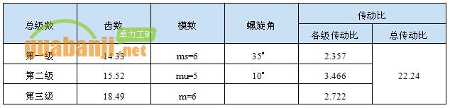 JS-30型減速器為三級減速,漸開線齒輪傳動??倐鲃訛?2.24。第一級為圓弧錐齒輪,第二級為圓柱斜齒輪,第三級為圓柱直齒輪。