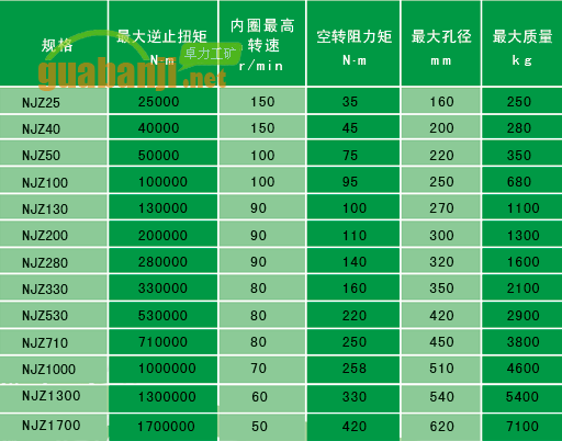 例如:代號NJZ 330-S-280,表示NJZ型接觸式逆止器,額定逆止力矩為330000 N.m,內圈轉向順時針,安裝孔直徑280mm。